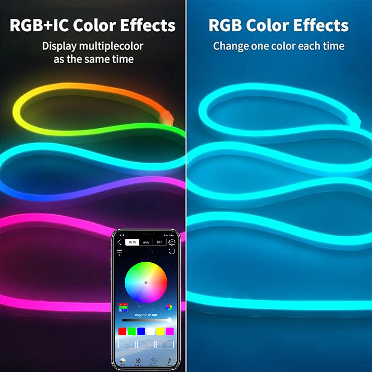 Bring vibrant color and creative lighting to your space with this 24V RGB Neon Strip Light — a flexible, waterproof LED rope with Bluetooth app control, remote, and music sync. Perfect for indoor and outdoor use in gaming rooms, patios, bedrooms, or parties.